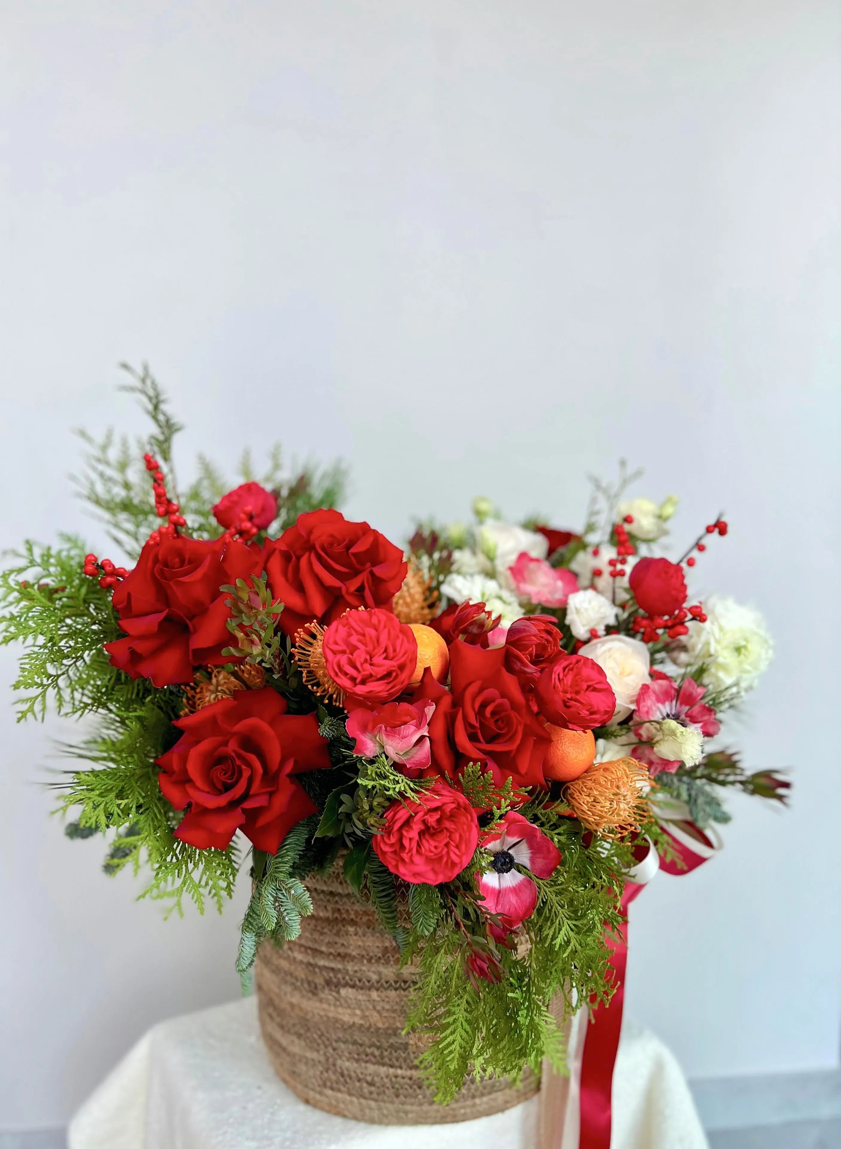 Роза одноголовая красная, кустовая роза пионовидная, пион, альстромерия, ирис, зелень, оазис, корзина.